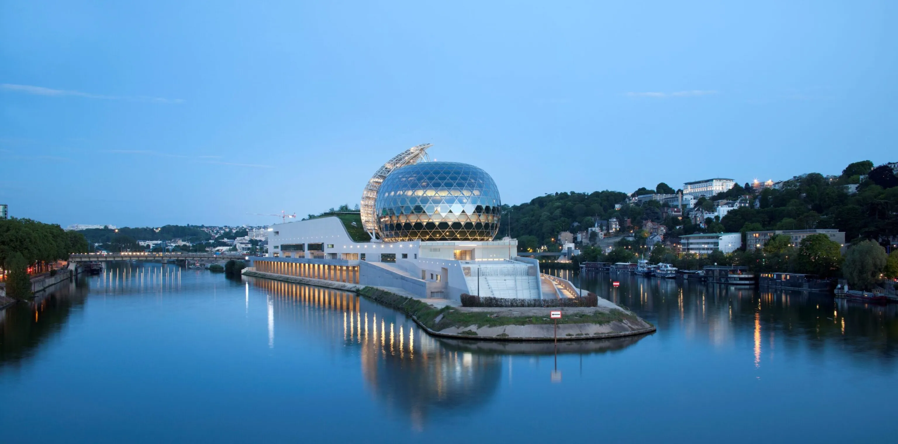 Conçue par l’architecte japonais Shigeru Ban, la Seine musicale, chef-d’œuvre de l’ingénierie consacrée à la musique, est un équipement culturel au rayonnement international. L’auditorium de 1 000 places est consacré à la musique classique. Sa façade est constituée d’une résille en bois autoportante, habillée de 4 000 m² de vitrage, autour de laquelle tourne une voile de 1 000 m² de panneaux solaires photovoltaïques, suivant la course du soleil. La grande salle, dédiée à la musique moderne amplifiée, est recouverte par une charpente métallique de 60 m de portée, et de 2 500 tonnes environ, qui supporte un jardin japonais.