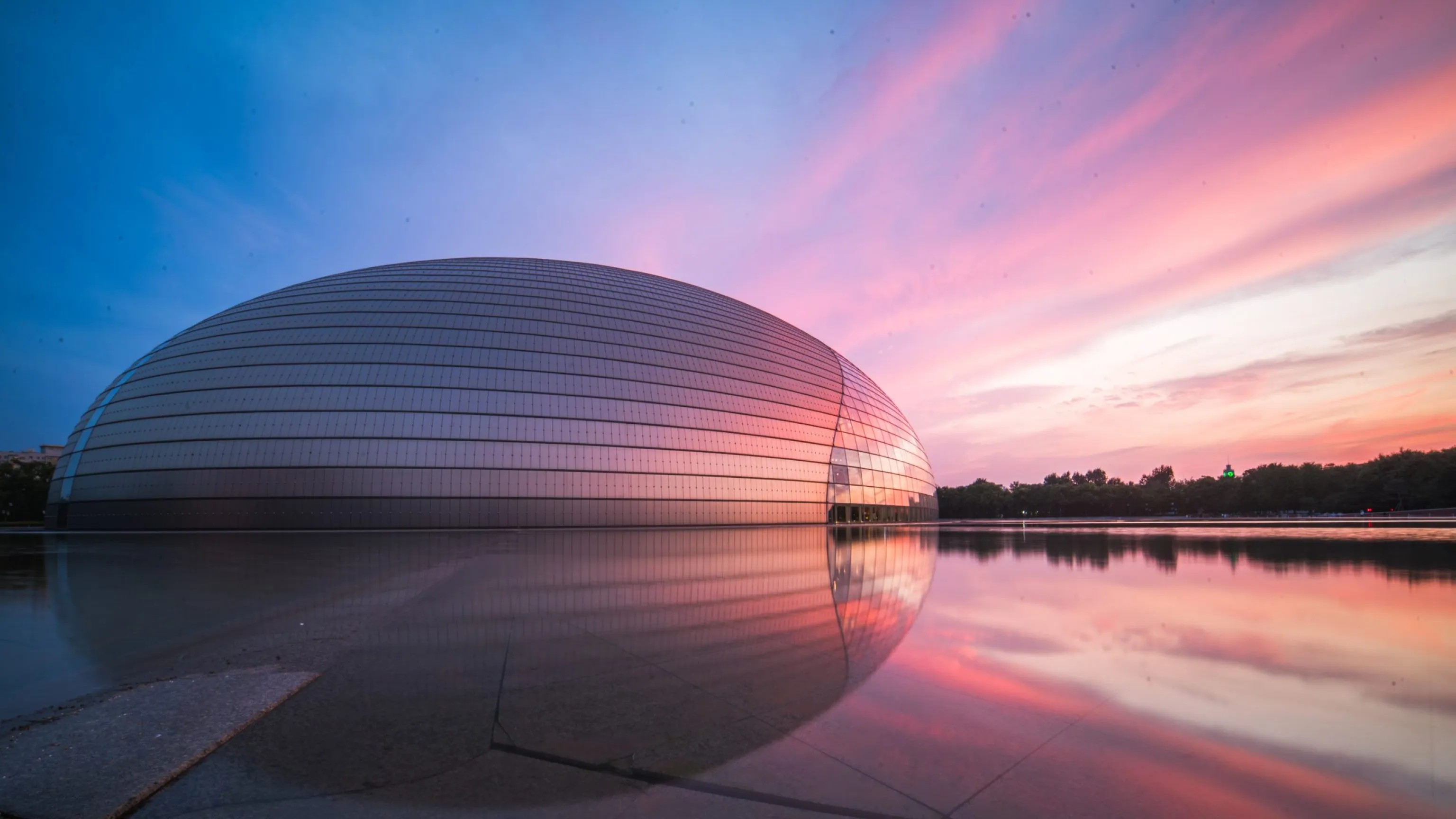 Paul Andreu a imaginé une grande zone de jardins et de constructions à caractère culturel dont la cité des théâtres constituerait l’entrée. L’édifice lui-même est un immense ellipsoïde de titane posé comme une île au centre d’un plan d’eau, accessible par une galerie de verre.