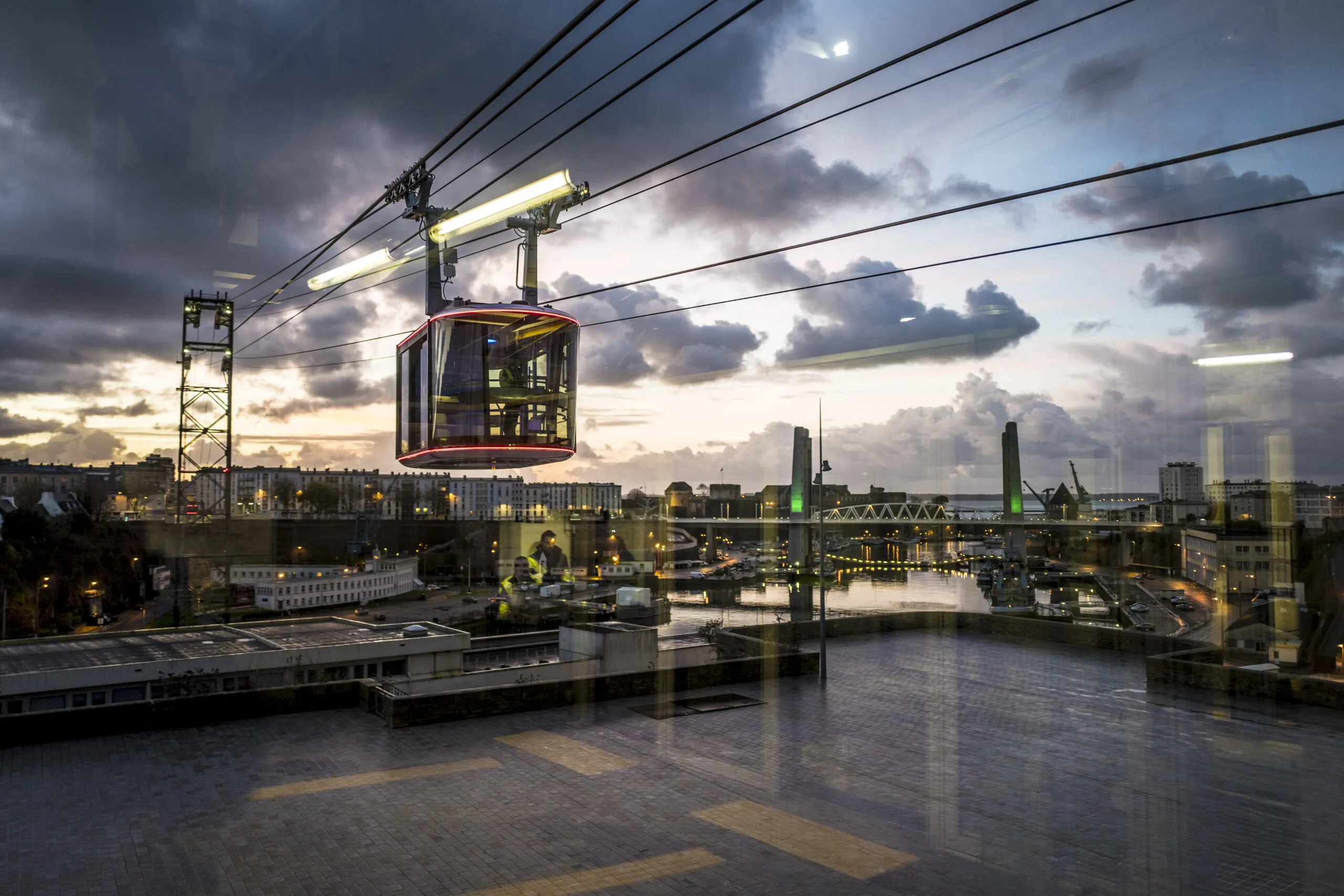 Le téléphérique survole le port de Brest. Avec une seule voie à chaque extrémité, la rencontre des cabines est assurée par un concept innovant : un croisement dans le plan vertical au centre du parcours, comme un « saut de mouton ». La station Siam est posée au sommet d’un mur de soutènement de 21,50 m de hauteur, datant de l’après-guerre. Une longrine en béton armé au sommet du mur constitue le relais entre les câbles du téléphérique et des tirants d’ancrage.