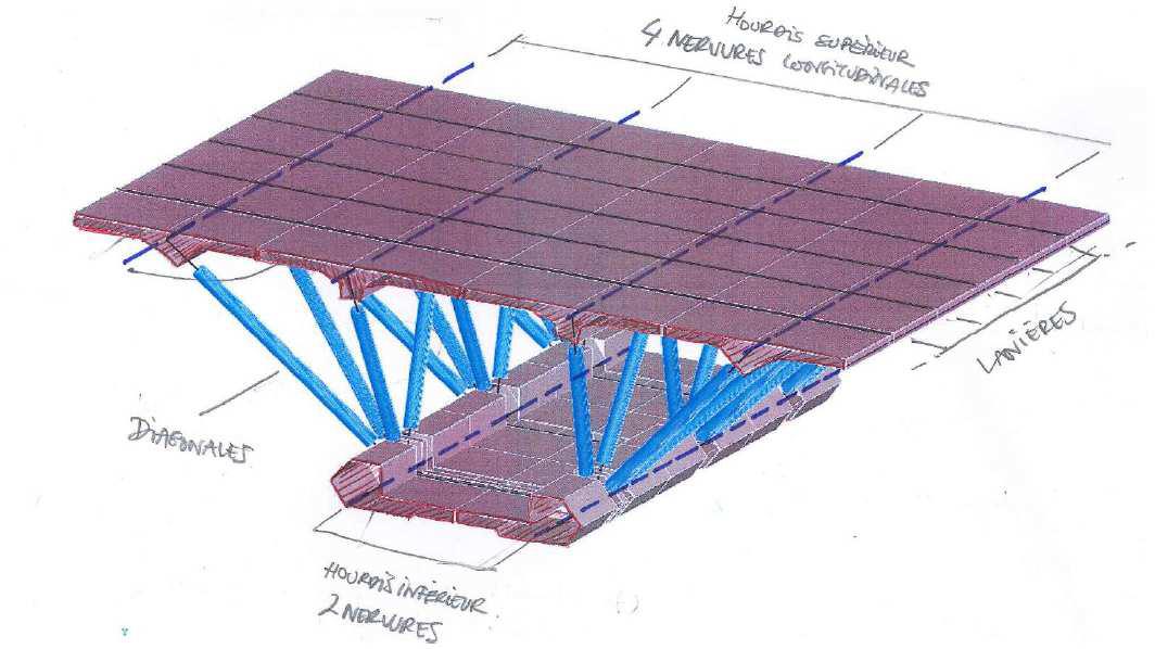 La précontrainte de continuité est extérieure au béton, située à l’intérieur du caisson treillis. Elle est injectée au coulis de ciment à l’intérieur de gaines en PEHD.