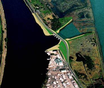 - un canal de 450 m de long, destiné à dériver, au travers d’un ouvrages de régulation, un débit de 400 mÑ/s de l’Orne dans le canal maritime et équipé de 4 vannes segment de 14,25 m de large chacune pour une hauteur de retenue normale de 3,50 m ;