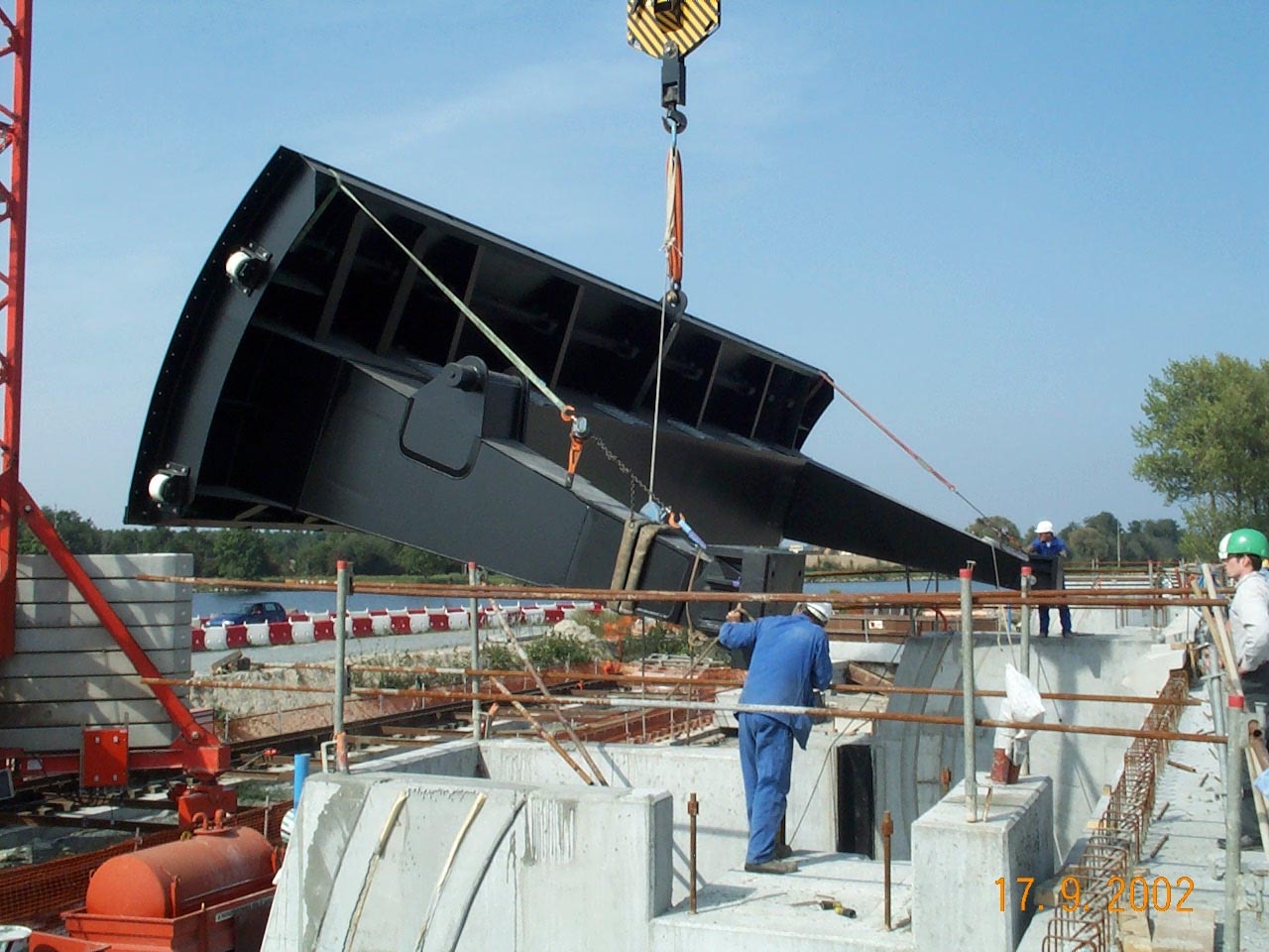 - un déversoir situé entre le canal maritime et l’estuaire de l’Orne, pour restitution du débit dérivé et équipé de 2 vannes segment de 10,00 m de large chacune pour une hauteur de retenue normale de 3,50 m ;